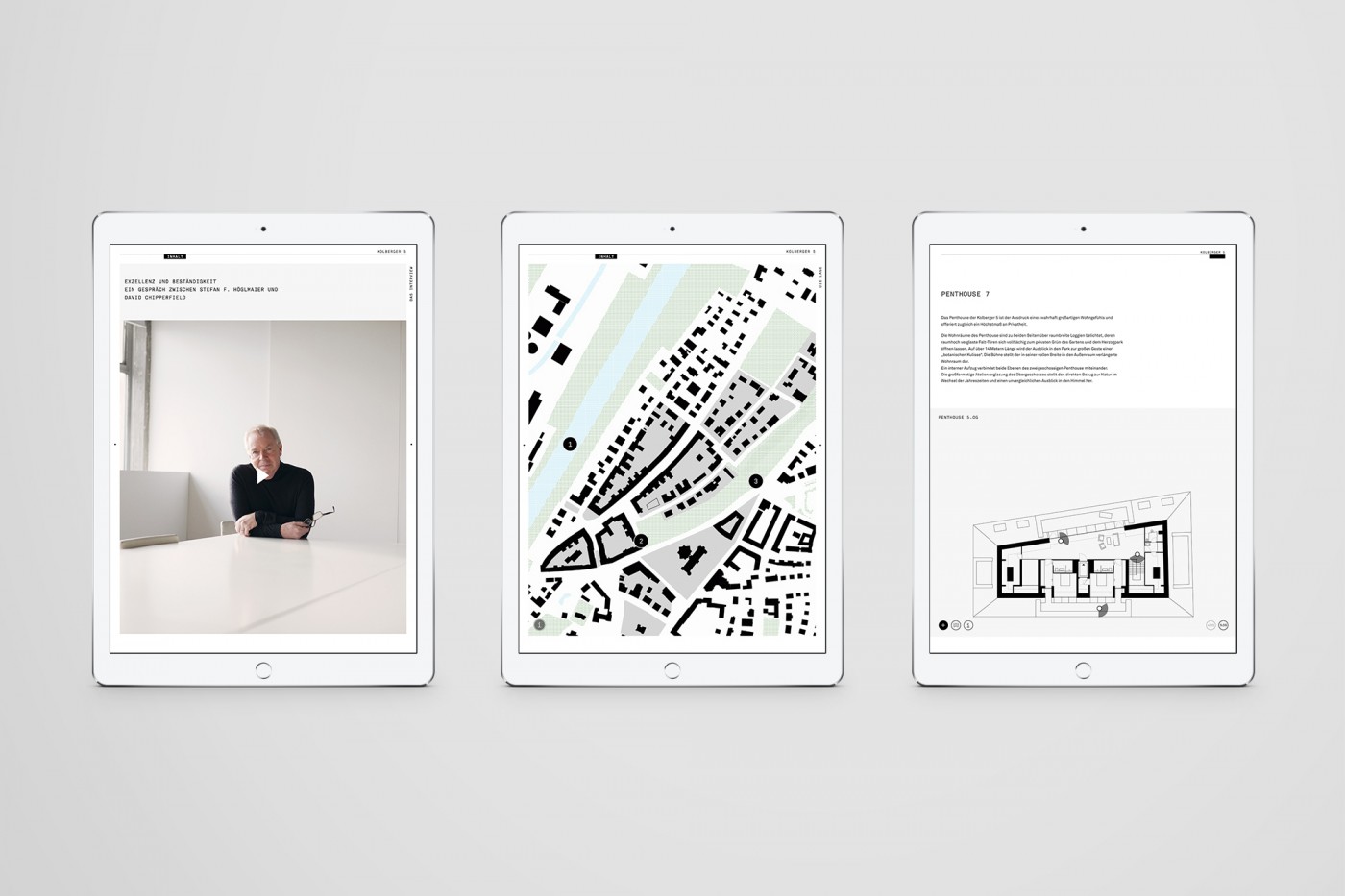 For us, the question was: How can we make these standards, the space of this property, haptically tangible and prepare it as an exposé? In order to do justice to the new concept of luxury, the decision of the intensive content preparation of the project fell on the form of a book as a valuable, analytical work that can profoundly tell the story of the project. Accompanying this were parts adapted for the website www.kolberger5.euroboden.de and individual sales exposés. The challenge here was revealed in mapping the architectural culture, a synergistic creative process in a digital environment. With the help of the digital tools and services we developed, we were able to create not only a visual impression on the website, but also provide information on dimensions and spatial sensations.
