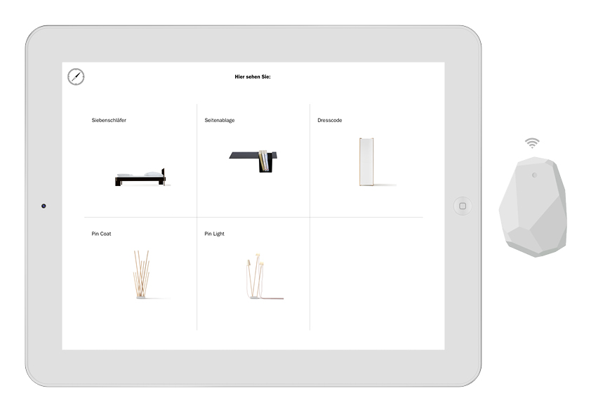 With the help of iBeacons, content is called up in the app. For this purpose, small transmitting units (beacons) were distributed throughout the exhibition tour. If the visitor approaches such a sensor, corresponding content is automatically called up on his iPad. For example, the boss himself appears in videos and guides the visitor through the exhibition or tells interesting anecdotes about the company's history. In this way, the visitor is provided with further background information on the furniture and can get to know the product range in a playful way.